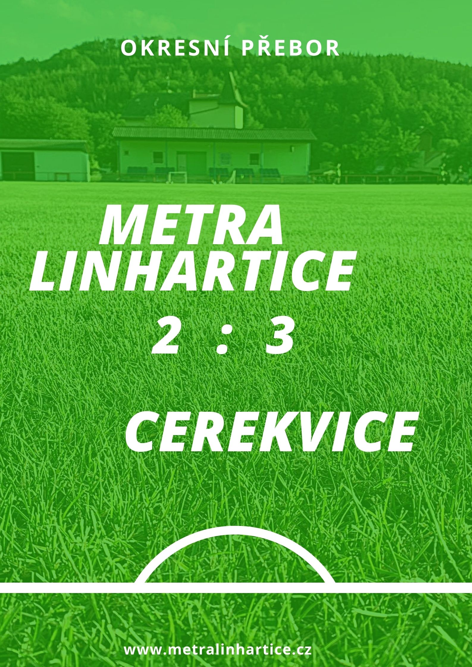 Metra Linhartice – Cerekvice 25 Kvě 2022Ondra Podle tabulky utkání 3. s posledním, ale na hřišti žádný rozdíl mezi soupeři nebyl. Domácí byli Cerekvici celé utkání vyrovnaným soupeřem.0