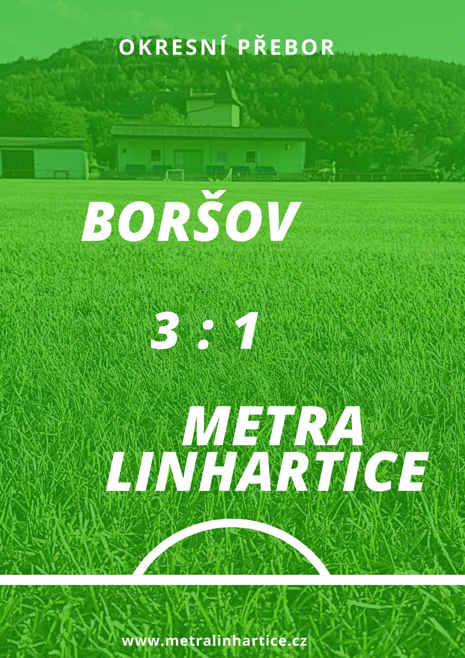 Boršov – Metra Linhartice 01 Čvn 2022Ondra Dvě nešťastné teče míče a spoustu neproměněných šancí rozhodli o osudu utkání. Už před utkáním se opět navršilo několik omluvenek, které způsobily, že na lavičce náhradníků zůstal jen trenér Richard Škrabal a Bohuš Lébiš.0